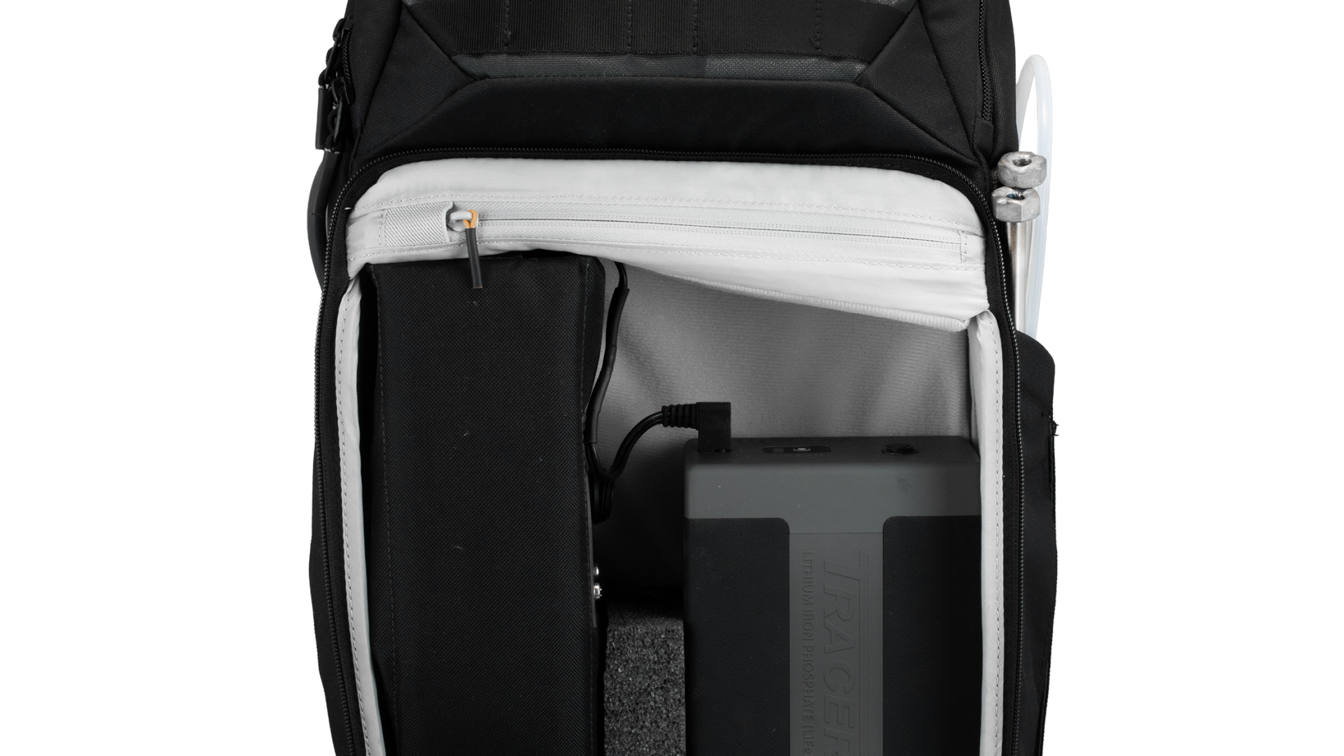 One bag contains the pump, the other contains six jars with sterile cotton wool. The pump supplied with the backpack can pump up to fifty litres of air into the sample container in four minutes. This comes down to approximately 12 litres per minute. You can choose how many litres of sample air the pump will draw.